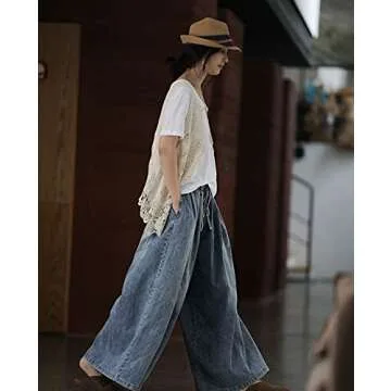 EXPOING Extra Wide Leg Denim Pants for Women Long Jeans Elastic Waist with Pockets Plus Size Loose Casual (Blue One Size Petite)