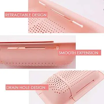 Extendable Colander Over the Sink Strainer basket - Extendable Sink Colander - Wash Fruits and Vegetable. Drain cooked Pasta and Dishes - Efficient Kitchen - Pink 8x19.5x2.8 inches