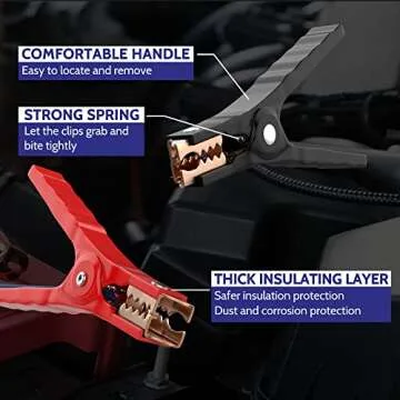 Each pair of jumper cables features a premium flexible cable made from high-density copper clad aluminum, ensuring excellent electrical conductivity. These cables remain flexible even in cold winters, which is essential for any driver facing sudden battery issues. The patented design of the clips comes with solid serrated teeth and strong springs, providing a firmer grip than other products on the market.