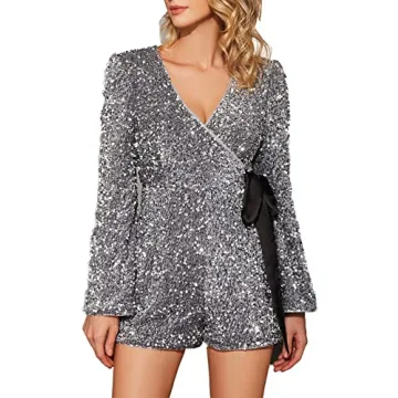 EXTRO&VERT Sequin Romper for Women Sparkly One Piece Jumpsuit Long Sleeve Disco Party Outfit