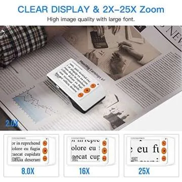 Show more If you or a loved one struggles with vision challenges, the Eyoyo 3.5-Inch Digital Magnifier could be the perfect solution. This portable device features an impressive 2X to 25X magnification, empowering users to read fine print, view small details in documents, or enjoy their favorite books with newfound clarity. Its ergonomic design ensures it is easy to hold and maneuver, making reading a comfortable experience. The magnifier is also incredibly user-friendly, featuring simple controls that allow quick adjustments to your desired text size.