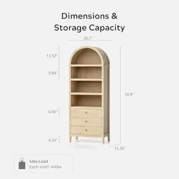 Show moreExperience the perfect blend of style and functionality with the EYYTHUNG 71" Tall Arched Cabinet. This exquisite storage solution features 4 open shelves and 3 drawers, providing ample space to display your favorite decor or store essentials. Its unique arched design and charming farmhouse aesthetic make it the perfect addition to any room in your home, whether in the living room, bedroom, or office. Made from high-quality laminate and durable board, this piece not only enhances your interior but also offers flexibility for all types of storage needs.