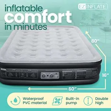 Show moreExperience the ultimate in outdoor sleeping comfort with the EZ INFLATE Air Mattress with Built-in Pump. Perfectly designed for both camping trips and sleepovers, this queen-size inflatable mattress sets up in just 2 minutes, ensuring you can start dreaming faster than ever! Made from high-quality, durable materials, its waterproof and puncture-resistant design promises lasting use so you can rest assured whatever the environment. With its comfortable double-high, 16-inch profile, you'll feel a real mattress comfort that rivals your own bed. Equipped with a premium, ultra-soft flocked top, this air mattress not only offers a cozy night's rest but also features excellent non-slip stability, enabling you to sleep soundly wherever you are.