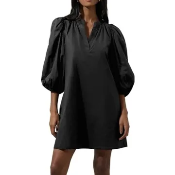 EZAPINE Women Babydoll Mini Dress Summer Casual Cotton V Neck Puff Lantern Sleeve Loose A Line Cute Dress Black XL