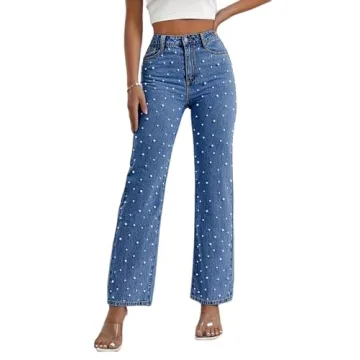 Show more Introducing the EZAPINE Womens Denim Jeans Straight Leg Pearls Beaded High Waist Pants—the perfect blend of elegant style and everyday comfort. Crafted from premium denim fabric, these jeans feature advanced high-stretch technology, ensuring a flattering fit and unparalleled durability. Designed with a chic high-waist and zip fly, they seamlessly enhance your silhouette while providing freedom of movement. The loose straight leg is complemented by unique faux pearl embellishments and sparkling diamonds, adding a sophisticated touch that makes these jeans stand out in any wardrobe.