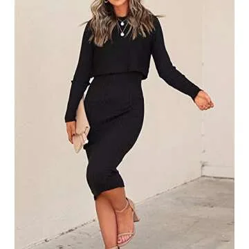 Ezbelle Women's Long Sleeve Sweater Dresses 2 Piece Outfits Sets Casual Ribbed Knit Crop Tops and Tank Bodycon Midi Dress Black Small