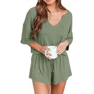 Ezbelle Women's V Neck Waffle Knit Pajamas Set Short Sleeve Crop Tops with Shorts 2 Piece Outfit Lounge Set Green Small