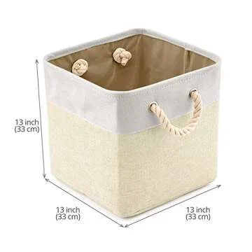 Show more Transform your space with the EZOWare Large Canvas Fabric Storage Basket Bins Set—a perfectly designed solution for decluttering your home, nursery, or child's room. This set of three stylish cube-shaped bins offers an elegant yet practical way to store a multitude of items such as clothes, toys, books, and linens. Made from durable twill and a blend of Cotton and Jute, these baskets not only support heavy loads but also come with a soft linen lining that protects your belongings. Measuring a generous 13 x 13 x 13 inches, they fit snugly into standard shelving units like KALLAX and Better Home and Garden (BHG). Their cream and light gray color scheme enhances any decor, adding a touch of sophistication while keeping your items neatly organized.