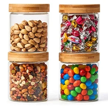 EZOWare Set of 4 Glass Food Jars with Airtight Natural Bamboo Lids, 20 fl oz Kitchen Clear Canister Storage Container Set for Storing Candy, Cookie, Rice, Sugar, Flour, Spices, Nuts, Coffee, Pasta