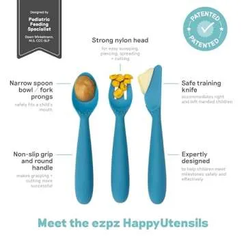 ezpz Happy Utensils - 24 Months+ (Blue) - BPA Free Toddler Utensils - Fork, Spoon and Knife for Toddlers and Preschoolers - Kids Utensils for Self-Feeding Development