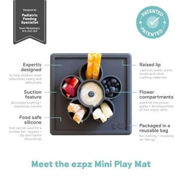 Show more Introducing the Mini Play Mat by ezpz, an ingenious all-in-one solution that seamlessly blends fun with functionality. This thoughtfully designed play mat doubles as a placemat and features charming flower compartments, making mealtime and playtime far more engaging for little ones. The stable base ensures minimal mess while encouraging independent play, fostering creativity and self-sufficiency in children.