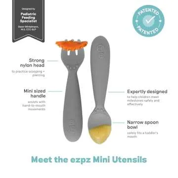 Show more Introducing the ezpz Mini Utensils Set, a thoughtfully designed toddler utensil set that makes mealtime not just an adventure, but an education for your little one. This set includes both a spoon and a fork, enabling toddlers to master the art of self-feeding with ease. Designed and tested by a pediatric feeding expert, these utensils facilitate essential developmental milestones, allowing children to confidently scoop with a spoon and pierce with a fork.