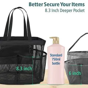 F-color Mesh Shower Caddy Portable, 8.3" Deeper Pockets Large Shower Caddy Bathroom Caddy for College Dorm Room Bathroom Essentials, 2 Handles Shower Bag Tote for Gym Rv, Camp with S Hook, Black