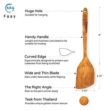 Show more Transform your cooking experience with the FAAY 13.5” Stir Fry Wooden Spatula. Handcrafted from premium golden teak, this spatula is not just a cooking tool; it’s a fusion of artistry and functionality designed for the modern kitchen. With its ergonomic handle and wide, thin blade, flipping and stirring ingredients becomes effortless. This spatula is engineered for durability; it won’t bend or break, making it perfect for handling large quantities of food. Whether you’re whipping up a casual family meal or a gourmet dish, the FAAY spatula will help you achieve perfect results every time.