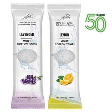 FabbPro Oshibori Moist Terry Cotton Refreshment Towels (50 Pack, 8 x 8 Inches) - White Mildly Scented Pre-moistened Towel to Use Hot or Cold - Lemon & Lavender Scent Bundle of 25 each