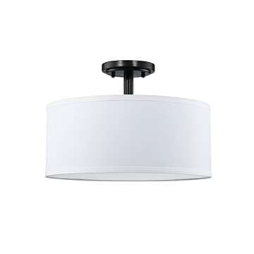 Fabric Drum Shade Semi Flush Mount Ceiling Light - Off White, Black, 13 Inch