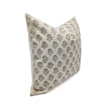 Fabritual Block Print Thick Cotton 14X14 Throw Pillowcase Cushion Cover Handmade Vintage for Sofa and Couch, Floral Printed Outdoor, Farmhouse with Boho Home Décor, Bagru Buti, Beige