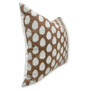 This pillow cover features a unique betel leaf block print; variations in color may occur due to the handmade process.