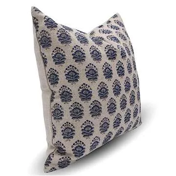 Fabritual Handmade 22x22 Inches Thick Linen Block Print Decorative Throw Pillowcase Cushion Cover with Invisible Zipper for Sofa, Couch, Fall, Christmas Decoration, Home Decor, Bheeshma, Light Blue
