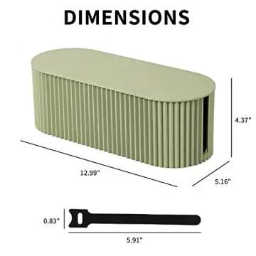 The package includes a small size green box with ample space for your cords at measurements of approximately 12.99”x5.16”x4.37”. With its heightened and widened design, the box comfortably accommodates standard power strips, making it a versatile addition to your home or office setup.