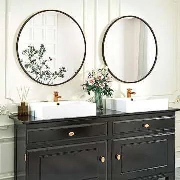 Show more Introducing the exquisite Fabuday Round Wall Mirror, designed to transform any space into an elegant oasis. Featuring a sturdy circular metal frame with a sleek matte black finish, this mirror is more than just a functional piece; it's a stunning statement in your bathroom or living area. The design is purposefully crafted to reflect light and make your rooms appear larger, bringing a touch of sophistication to any home decor.