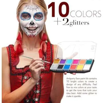 Show more Unleash your creativity with our Face Paint Kit - the ultimate solution for aspiring artists and seasoned professionals alike! Dermatologically tested and crafted specifically to cater to the sensitive skin of kids and adults, this premium water-based face and body paint kit combines safety, quality, and ease of use. Unlike cheap alternatives that feel like stickers on your skin, our vibrant colors deliver a natural appearance while being easy to apply and remove. Packed with 10 stunning hues, including 1 silver and 1 gold glitter, alongside 3 brushes for flawless application, it’s time to transform any event into an artistic masterpiece!