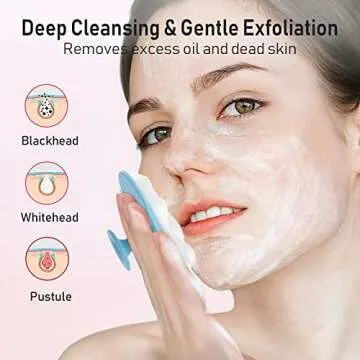 Show more Transform your skincare routine with our revolutionary manual face cleansing brush designed to deeply cleanse and rejuvenate your skin. This exceptional product features a unique blend of thick and fine bristles that efficiently remove dirt, oil, and dead skin cells while offering a soothing massage experience. The narrow front end is meticulously crafted to fit the contours of your face and T-zone, ensuring a comprehensive cleanse from every angle. Whether you have sensitive, dry, or oily skin, this reusable face exfoliator brush is made of food-grade silicone that is gentle, hygienic, and non-irritating, making it suitable for all skin types.