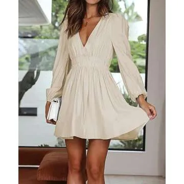 Show moreThe FAIABLE Mini Dress brilliantly encapsulates a blend of style and comfort, making it a must-have addition to your wardrobe. This sexy deep V neckline dress features elegant lantern long sleeves with soft elastic cuffs, giving the dress a unique charm that stands out in both casual and semi-formal settings. The A-line silhouette not only provides a flattering fit for various body types but also brings a delightful flow as you move, making it suitable for vibrant summer outings and cozy autumn gatherings. Made from a soft, lightweight fabric with a slight elasticity, this mini swing dress feels luxurious against the skin and is easy to slip on and off, ensuring you'll be prepared for any occasion in seconds.