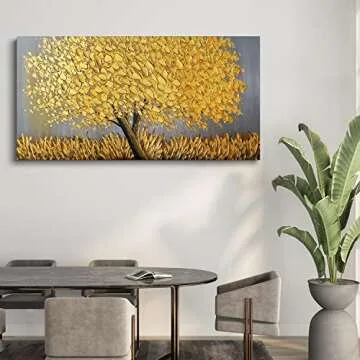 Faicai Art Thick Texture Gold Tree Paintings Canvas Wall Art Hand Oil Canvas Paintings 3D Palette Knife Canvas Artwork Wall Decor for Living Room Bedroom Office Stretched Ready to Hang 24"x48"