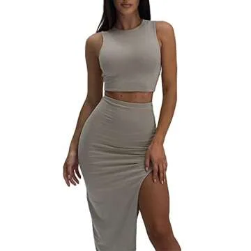 Show more Step out in style and grace with the FAIMILORY High Slit Long Skirt Sleeveless Crop Tank Tops Casual Summer Women Sexy Nightclub Split Thigh Bodycon Going Out Two Piece Midi Dress Sets. Crafted to become a staple in your summer wardrobe, this stunning two-piece set combines a chic tank crop top with a high-waisted midi skirt, allowing you to flaunt your silhouette with confidence and elegance. The solid grey color instantly elevates its versatility, making it a perfect choice for both casual outings and special events.