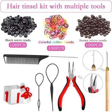 Show more Transform your hair with the enchanting Fairy Hair Tinsel Kit, featuring 3200 strands of premium quality hair tinsel in 12 dazzling colors! This kit not only includes a variety of vibrant tinsel, but it also comes with all the essential tools for easy application, including a crochet hook, plier, micro silicone link rings in two colors, ponytail hoop tools, and a rat tail comb. Whether you're looking to add a touch of shimmer to your everyday look or planning a special event, this kit is a fantastic value for the creative souls who want to unleash their inner sparkle.