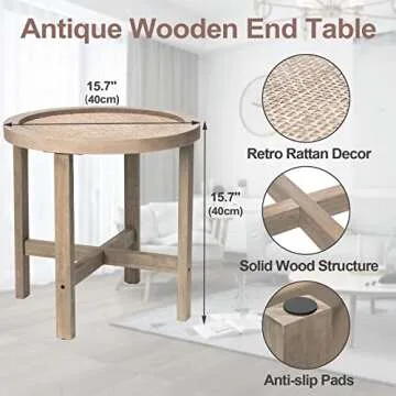 FairyHaus End Tables Living Room, Small Side Tables Living Room Bedroom for Small Spaces, Rattan Round End Table with Wood Legs 15.7in