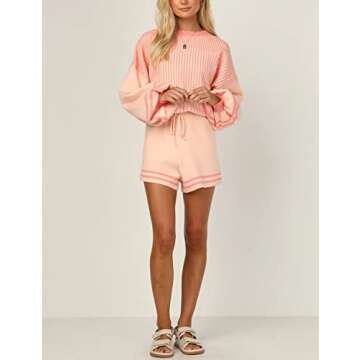 Show moreIntroducing the Faleave Women's 2 Piece Outfits Knitted Striped Sweater Crewneck Pullover Tops Shorts Set, your go-to ensemble for effortless chic this spring and summer! This stylish and cozy combination features a fashionable knitted top with a delightful vertical stripe pattern, designed to elevate your lounge-wear game. Featuring a ribbed crewneck and long lantern sleeves, this outfit merges comfort with sophistication, making it a must-have addition to your wardrobe.