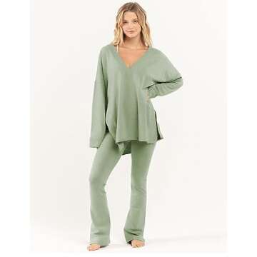 Faleave Women's Oversized 2 Piece Outfits Reversible Long Sleeve Tops High Waisted Flared Pants Lounge Sets Tracksuit(PeaGreen-M)