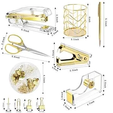 Famassi Gold Desk Accessories,Office Supplies Set Acrylic Stapler Set Staple Remover, Tape/Pen Holder, 2 Ballpoint Pen, Scissor, Binder/Paper Clips and 1000pcs Staples.