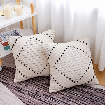 Show more Introducing the famibay 2 Pack Handwoven Boho Throw Pillow Covers – the perfect blend of style and comfort for your home. Measuring a generous 18 inches by 18 inches, these pillow covers are designed to fit standard throw pillows perfectly, giving your living space a refreshing touch. Crafted from a durable fabric mix of 45% Cotton, 45% Polyester, and 10% Viscose, with a sturdy canvas back, these covers promise longevity without compromising on comfort. The eye-catching black line Moroccan geometric pattern is not just visually appealing but also adds a chic, bohemian vibe to any indoor or outdoor setting.