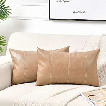 Fancy Homi Tan Long Lumbar Waterproof Faux Leather Decorative Throw Pillow Covers 14x24 Inch for Living Room Couch Bed, Beige Hand Stitched Cushion Case 35x60 cm, Taupe Modern Farmhouse Home Decor