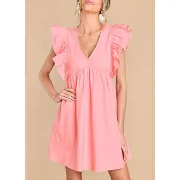 FANCYINN Women's Summer Casual Babydoll Mini Dress Ruffle Sleeveless Deep V Neck Pleated Swing Flowy Tunic Dress Pink L