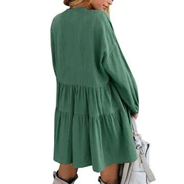 Show moreStep into style and comfort with the FANCYINN Women Shift Tunic Ruffle Dress, an exquisite addition to any wardrobe. This mini dress features long lantern sleeves and a v-neck design that highlights your neckline while providing a relaxed fit. Made from a super lightweight cotton blend, this dress breathes with you, ensuring maximum comfort on even the hottest summer days. The rich dark green color is fully lined for modesty, while offering a chic look perfect for any occasion.