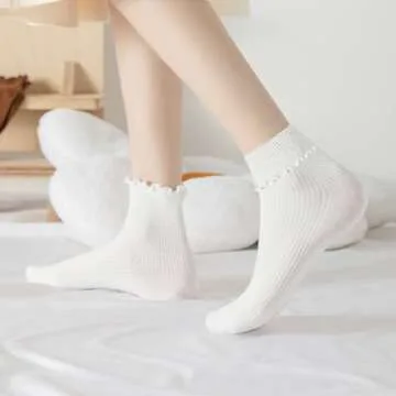 Fandecie 8 Pairs Frilly Socks Women,Ruffle Socks for Girl Women,Cute Ankle Socks for Women,Solid Color Lettuce Edge Comfort Breathable One Size 5-9,White,Black and Grey