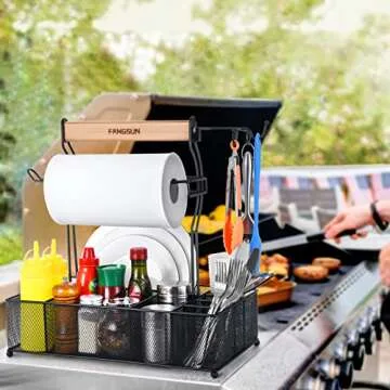 Show more Introducing the ultimate solution for your outdoor grilling and picnic needs: the FANGSUN Large Grill Utensil Caddy. This exceptional caddy boasts an extra large capacity, specifically designed with 8 meticulously crafted compartments. Perfect for organizing all your barbecue accessories, picnic supplies, camping gear, and even cleaning products, this caddy brings convenience right to your outdoor adventures. Equipped with a dedicated paper towel roll holder and 3 convenient hanging hooks, everything essential for your outdoor feast is organized and easily accessible while taking up minimal space.