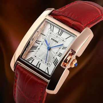 FANMIS Womens Watches Rose Gold Case Roman Numeral Luxury Wristwatch Square Brown Leather Strap Watch (Red)