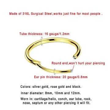 Show more Discover the ultimate stylish accessory with these stunning gold hoop earrings, crafted with precision from high-quality 316L surgical steel. With a delicate tube thickness of 1.2mm and a snug pin thickness of 0.8mm, these earrings feature an inner diameter of 8mm, making them perfect for various types of piercings. Designed for everyday elegance, these dainty earrings shine brightly, offering a polished surface that ensures comfort with no sharp edges, allowing you to wear them all day long without worry.