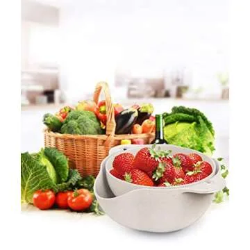 Show more Introducing the Fantasee Multifunctional Kitchen Rolling Colander, a game-changing kitchen tool designed for efficiency and ease. Crafted from natural wheat straw fiber, this colander is not only durable but also eco-friendly, ensuring that your culinary adventures are safe and sustainable. Completely non-toxic and BPA-free, it lets you wash and prepare your fruits and vegetables without worrying about harmful chemicals. With its innovative 2-in-1 design, it seamlessly combines the functionality of a colander and a bowl, making it an essential item in every kitchen.