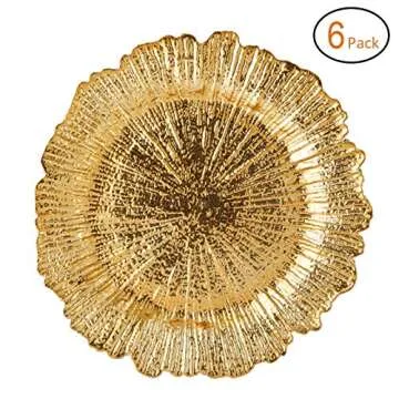 Show moreEnhance your dining experience with our FANTASTIC :) Round 13 Inch Plastic Charger Plates, beautifully designed to impress your guests at every meal. The stunning reef gold electroplating finish gives these plates an elegant look, perfect for any formal gathering or festive occasion. Sized at 13 inches, they provide a generous base for your dinnerware, making them not only a decorative accessory but also a practical base for your plates and bowls. These charger plates are crafted from high-quality plastic, ensuring durability while maintaining a lightweight feel, ideal for easy handling and transportation.