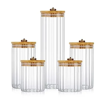 The jars are made of lead-free high borosilicate glass with bamboo lids and metal pull rings.