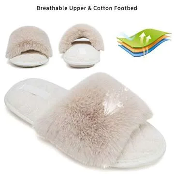 FANTURE Women's Furry Faux Fur Slippers Cozy Memory Foam House Slippers Soft Comfy Flat Slide Sandals Indoor Outdoor-U419WMT035-Beige-38-39