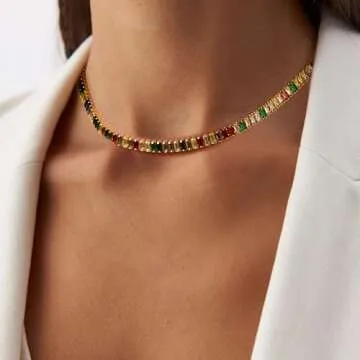 FANZE Sparkly Tennis Necklaces for Women Multicolor Cubic Zirconia Gold Plated Choker Necklace Dainty Jewelry Gifts for Holiday