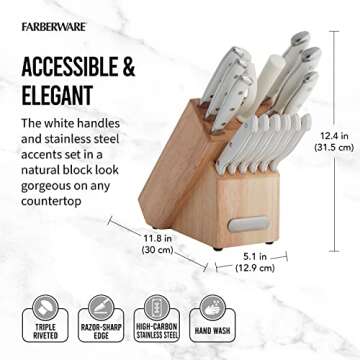Show more Elevate your cooking experience with the Farberware 15-Piece Forged Triple Rivet Knife Block Set. Designed for both style and functionality, this exquisite knife set is perfect for culinary enthusiasts and home cooks alike. Each knife in the collection boasts high-carbon stainless steel blades that ensure durability and razor-sharp precision, making food preparation a breeze. The elegant white handles add a modern touch to your kitchen, while providing a comfortable, ergonomic grip for seamless cutting and slicing. Whether you're chopping vegetables or carving meats, this versatile set offers everything you need to unleash your inner chef.