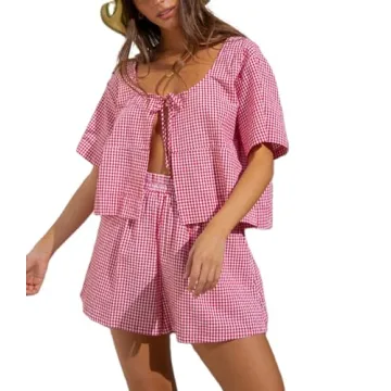 Show moreDiscover the ultimate blend of elegance and comfort with the Faretumiya Women Tie Front Pajama Sets. This stunning 2 piece set features a delightful combination of a puff sleeve plaid babydoll shirt and chic ruffle hem shorts, crafted from lightweight and soft polyester material. Perfectly designed for every trendy woman, these pajamas not only ensure a good night's sleep but also let you lounge in style. Embrace the iconic Y2K fashion with its striking sexy pink color, making it a trendy choice for homewear or casual outings.